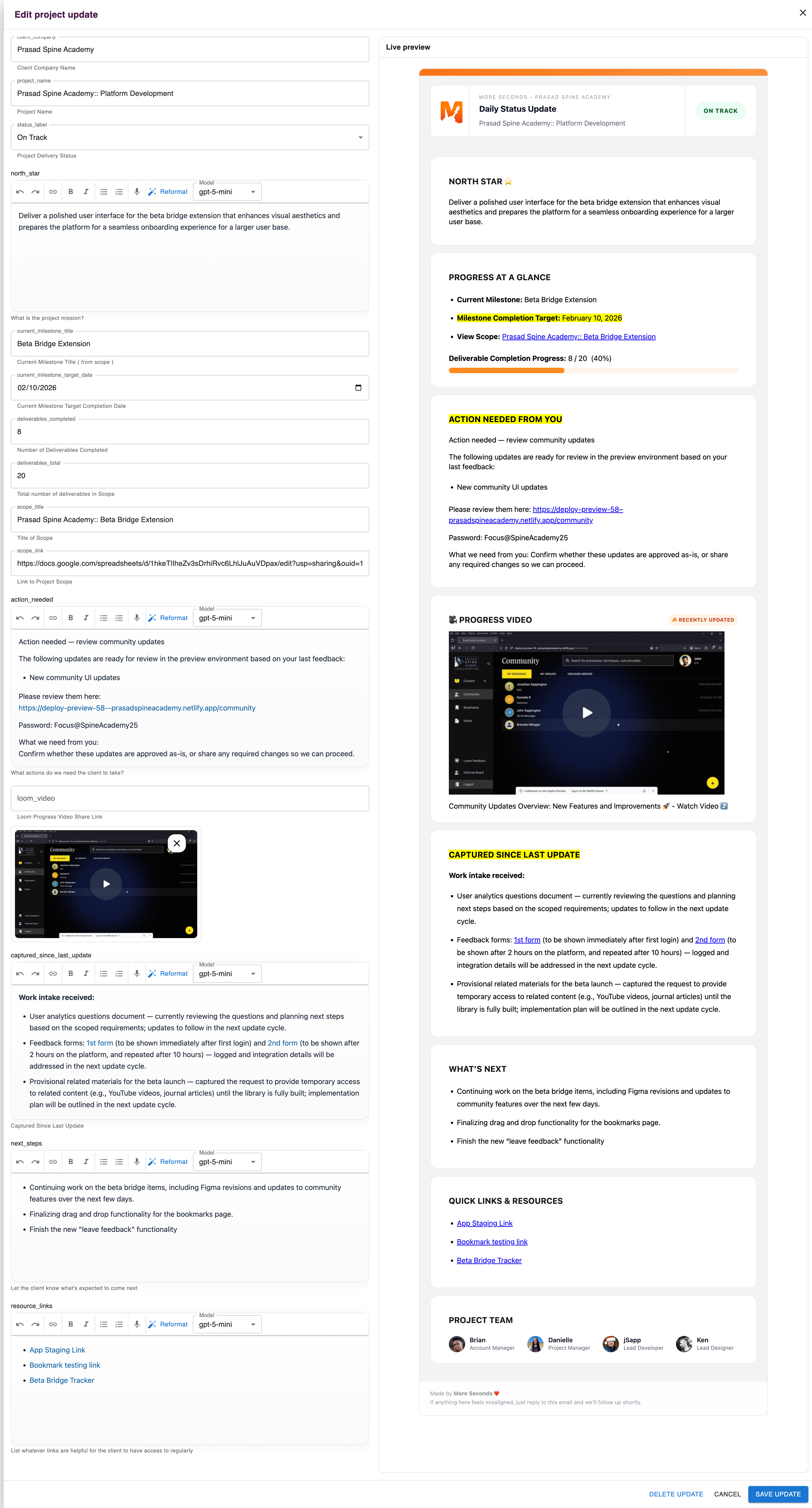 We rebuilt how we communicate with clients at More Seconds—turning text-heavy status updates into a clear, visual system that drives daily engagement, faster decisions, and full project visibility.